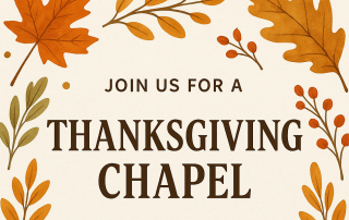 There will be a combined chapel service at the VBC auditorium from 8:30-9:30 AM on Tuesday, November 25. Drop-offs and pick-ups will take place there. Before school care will begin at 7:15 AM in the Fellowship Hall. The Elementary Choir will be singing and the Pre K and K5 students will have a small program.